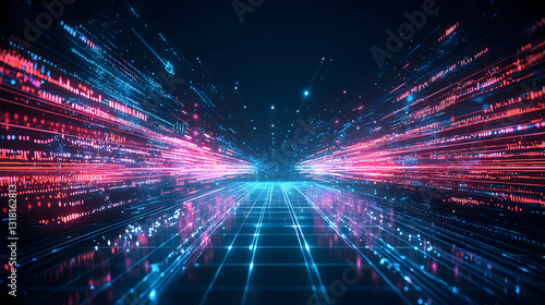 Abstract Digital Data Stream Tunnel With Blue And Red Lights And Glowing Particles