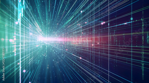 Abstract Digital Data Stream Tunnel with Bright Blue and Green Lines and Light Effects in Futuristic Design