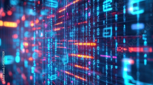 Abstract digital data stream with glowing binary code and vibrant colors.