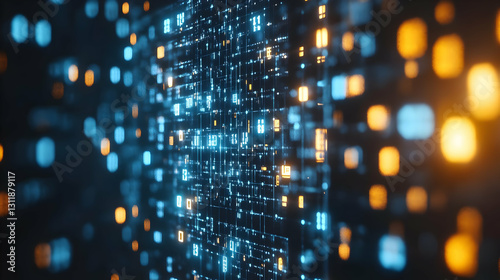 Abstract Digital Data Stream with Glowing Blue and Orange Squares