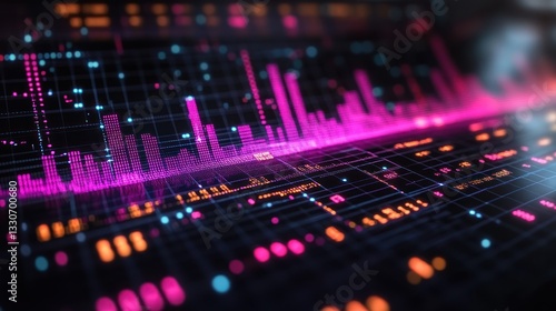Abstract Digital Data Visualization: Neon Pink and Orange Waves on a Dark Grid