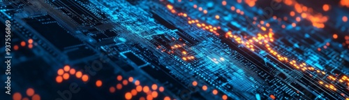 Abstract digital data visualization with futuristic elements and glowing lights, representing technology, data flow, and innovation.