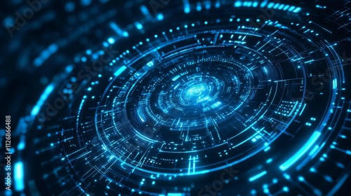 Abstract digital design featuring glowing blue circular patterns and lines.
