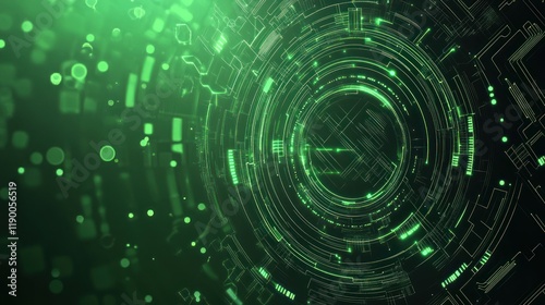 Abstract digital design featuring green circular patterns and circuit-like elements.