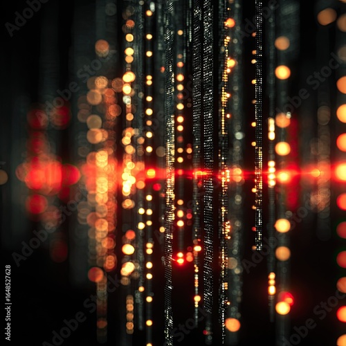 Abstract digital display with glowing, cascading data streams and vibrant red highlights