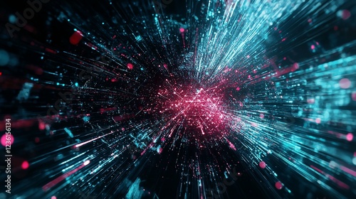 Abstract digital explosion with vibrant lines and particles emanating outwards
