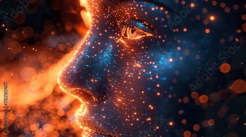 Abstract Digital Face with Dazzling Blue and Orange Lights