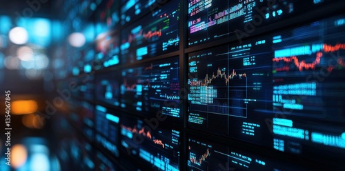 Abstract digital financial trading visualization with colorful charts and data on a dark background, showcasing market trends and analytics