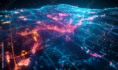 Abstract digital glowing city and its networked connectivity infrastructure