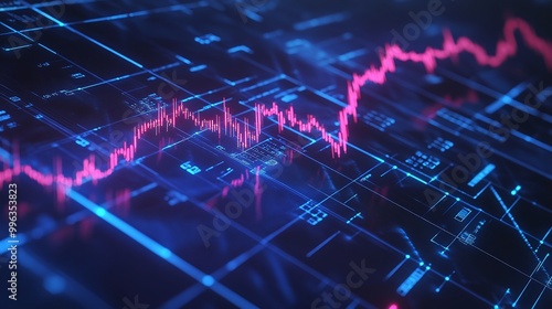 Abstract digital graph showing fluctuating statistics and data trends in vibrant blue and pink hues.
