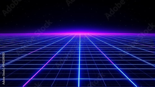 Abstract digital grid with neon blue and purple lines forming a futuristic landscape, visualizing advanced technology, digital networks, and cutting-edge design in a high-tech world.