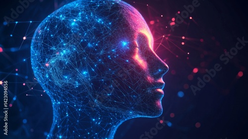 Abstract digital human face profile network connections blue red ai art data dark glow dots mesh