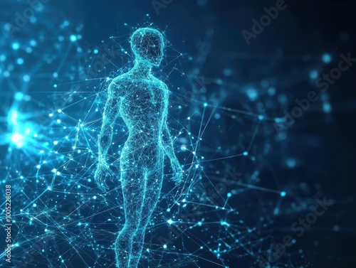 Abstract Digital Human Figure, Connected by Lines and Dots, Blue Background.