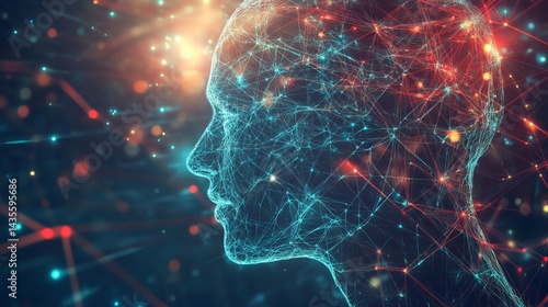 Abstract digital human head network connection lines technology web red data mesh grid dots blue dark
