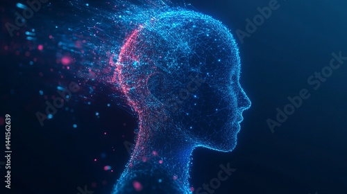 Abstract digital human head profile in blue and pink network ai 3d art data glow cyber space lines