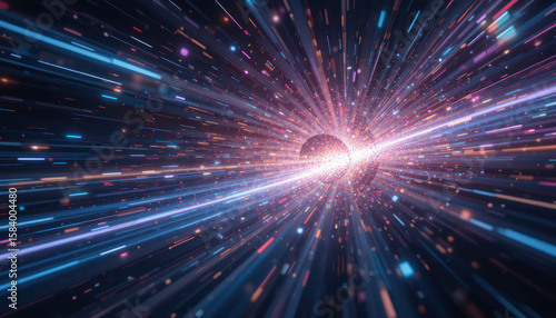 Abstract digital illustration of light streaks converging towards a central glowing sphere in a dark space.