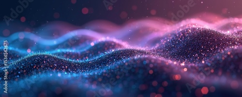 Abstract digital illustration with big data visualization concept. Futuristic neon waves of sound in space. Glowing particle flow, cybernetic music stream with dots. Tech background.
