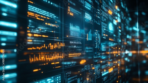Abstract Digital Interface with Blue and Orange Glowing Lines and Data