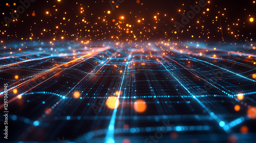 Abstract Digital Landscape Neon Blue and Orange Grid Design