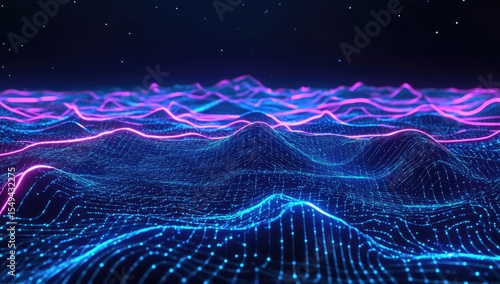 Abstract digital landscape of interconnected lines and points. Vast, vibrant, night-sky backdrop