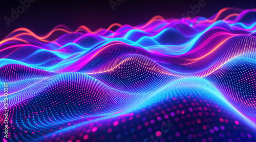 Abstract digital landscape of vibrant neon-hued undulating waves composed of interconnected glowing particles, creating a dynamic and energetic visual effect