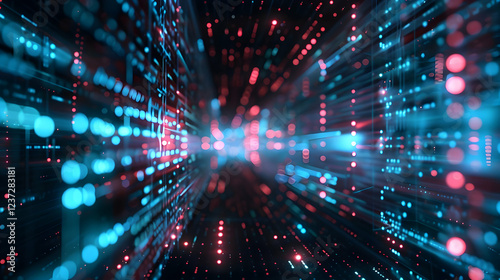 Abstract digital landscape with blue and red glowing particles creating a sense of depth.