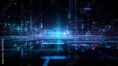 Abstract digital landscape with bright blue and purple lights and glowing lines in dark background