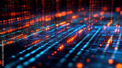 Abstract digital landscape with glowing lines and dots representing data flow.