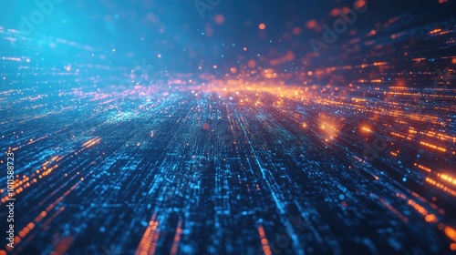 Abstract digital landscape with glowing particles and lines, representing data flow.