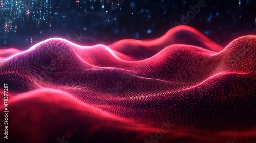 Abstract digital landscape with glowing red and pink wave-like formations composed of numerous tiny dots under a dark starry background emitting a futuristic and vibrant atmosphere