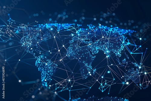 Abstract digital map of the world with global network connections on a blue background, representing the world wide web concept, using light white and dark navy colors with white space, in a flat illu