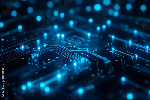 Abstract digital network circuit board background banner featuring connecting data points in blue and black colors. This design emphasizes the complexity and sophistication of modern technology