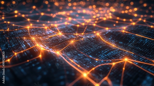 Abstract Digital Network Connection Background with Glowing Orange Lines and Bokeh Lights.