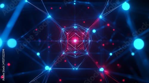 Abstract Digital Network Connection with Bright Red and Blue Light Beams in a Futuristic Space Environment