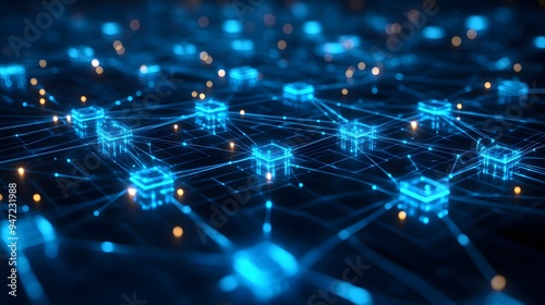 Abstract digital network image with glowing blue lines and dots on dark background