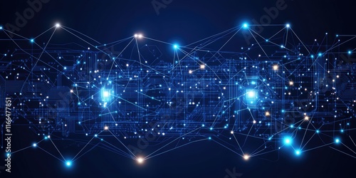 Abstract digital network visualization with interconnected nodes and glowing elements.