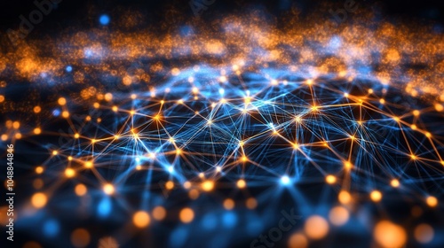 Abstract digital network with glowing blue and orange lights, representing data connections and technology advancements.