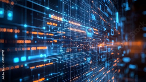 Abstract Digital Network With Glowing Blue And Orange Lines And Data