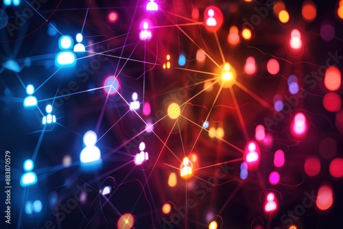 Abstract digital network with glowing icons of people and a circle on a black background for a social media