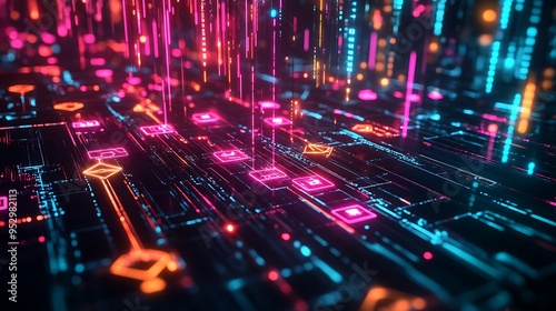 Abstract Digital Network with Neon Lights and Geometric Shapes