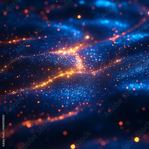 Abstract digital photo depicting shimmering golden and blue particles against a dark background