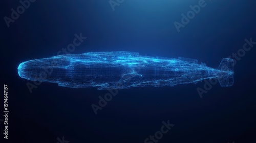Abstract digital rendering of a submarine, glowing blue lines forming its shape against a dark blue background.