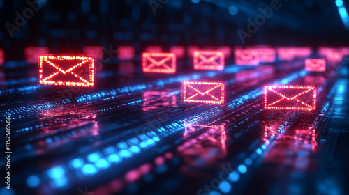 Abstract digital representation of email communications in cyberspace with flowing light trails, bright light, and blurred chaos symbolizing the speed, complexity, and connectivity of modern communica