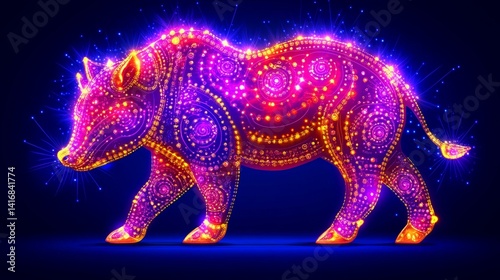 Abstract digital rhinoceros illustration with vibrant magenta and golden fractal light patterns against a dark blue background generating a striking ethereal effect