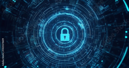 Abstract digital security background with a padlock symbol and a blue circular pattern, a vector illustration of a data protection technology concept. A large lock in the center on a dark, abstract,