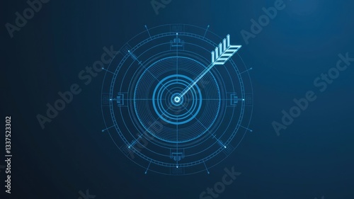 Abstract digital target with an arrow in the center. Growth strategy or financial goal concept. Futuristic low poly wireframe vector illustration on blue technology modern background. The bull's eye