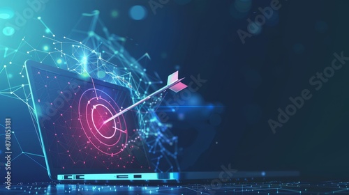 Abstract digital target with an arrow on a laptop screen. SEO optimization, SMM, and Goal Achievement concepts. Strategy and planning website banner on technology blue background. Futuristic low poly.