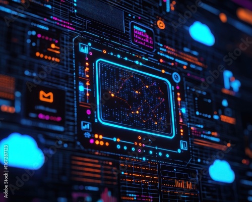 Abstract Digital Technology Background Featuring Network Connections, Circuit Patterns, and Cloud Icons for Innovative Applications and Projects
