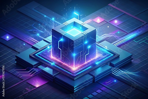 Abstract digital technology background. Isometric AI chip with AI hologram with circuit tech bg. Connected lines electric lightning. Bright light neon blue quantum CPU processor. illustration