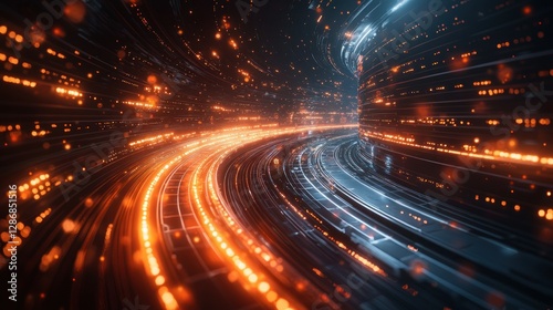 Abstract digital tunnel, swirling lines, futuristic, city lights